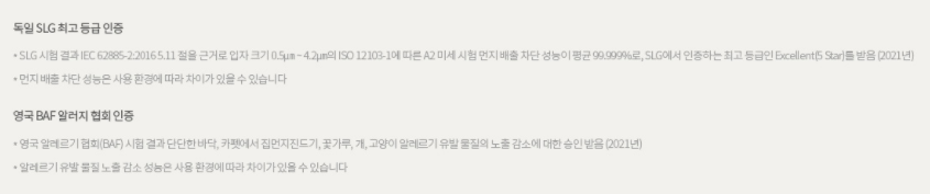 올인원 타워에는 고성능 미세먼지 차단 시스템이 들어가 있다. 비워낸 먼지는 모터보호필터와 고성능 배기필터로 필터링하며 영국 BAF 알러지 협회 인증까지 받았다고 한다.