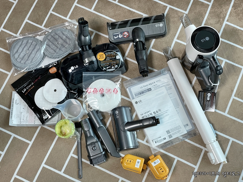 먼저 LG 오브제컬렉션 청소기 구성품을 다 꺼내보았다. 무선청소기 본체와 스틱, 파워드라이브 물걸레와 침구흡입구, 틈새흡입구, 다용도흡입구, 파워드라이브 마루, 배터리 2개, 일회용 물걸레, 다회용 물걸레, 설명서 등이 들어있었다. 참, 파워드라이브 마루 흡입구는 A9 흡입구보다 약 11mm 낮아져 슬림해졌다.