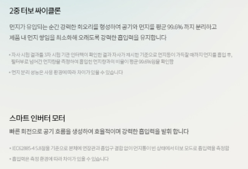 올인원 타워에는 고성능 미세먼지 차단 시스템이 들어가 있다. 비워낸 먼지는 모터보호필터와 고성능 배기필터로 필터링하며 영국 BAF 알러지 협회 인증까지 받았다고 한다.