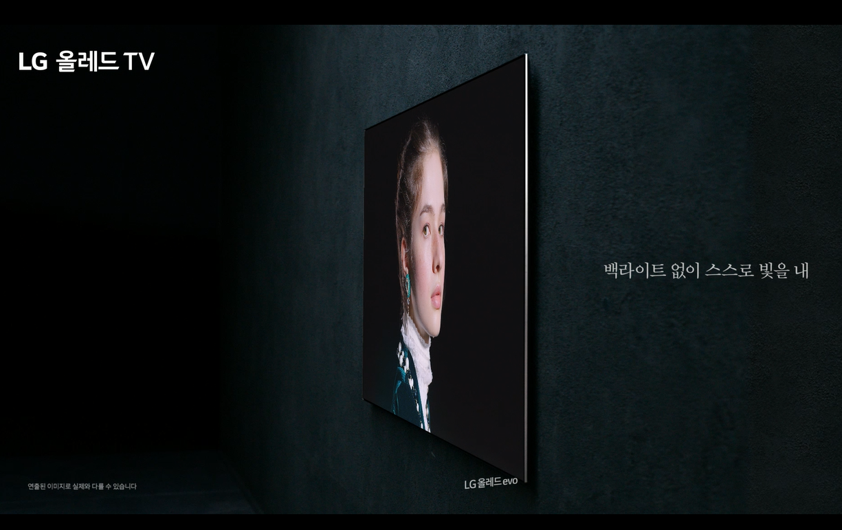 TV 하나에 화면 구동부, 스피커, 설치를 위한 브라켓까지 담아서 별도 외부 본체가 필요없는 슬림한 갤러리 디자인을 보유한 LG 올레드 evo 역시 신규 CF속에서 존재감을 뽐내고 있다.벽에 걸 경우 본체 없이 화면만 돋보이는 미니멀한 인테리어를 할 수 있고 갤러리 느낌으로 연출이 가능하다. 벽걸이로 사용이 어려울 경우 스탠드 형으로도 사용이 가능하다는 특징이 있다. LG 올레드 evo는 21년형 신제품으로 한층 업그레이드 된 evo 패널을 탑재하고 있다.