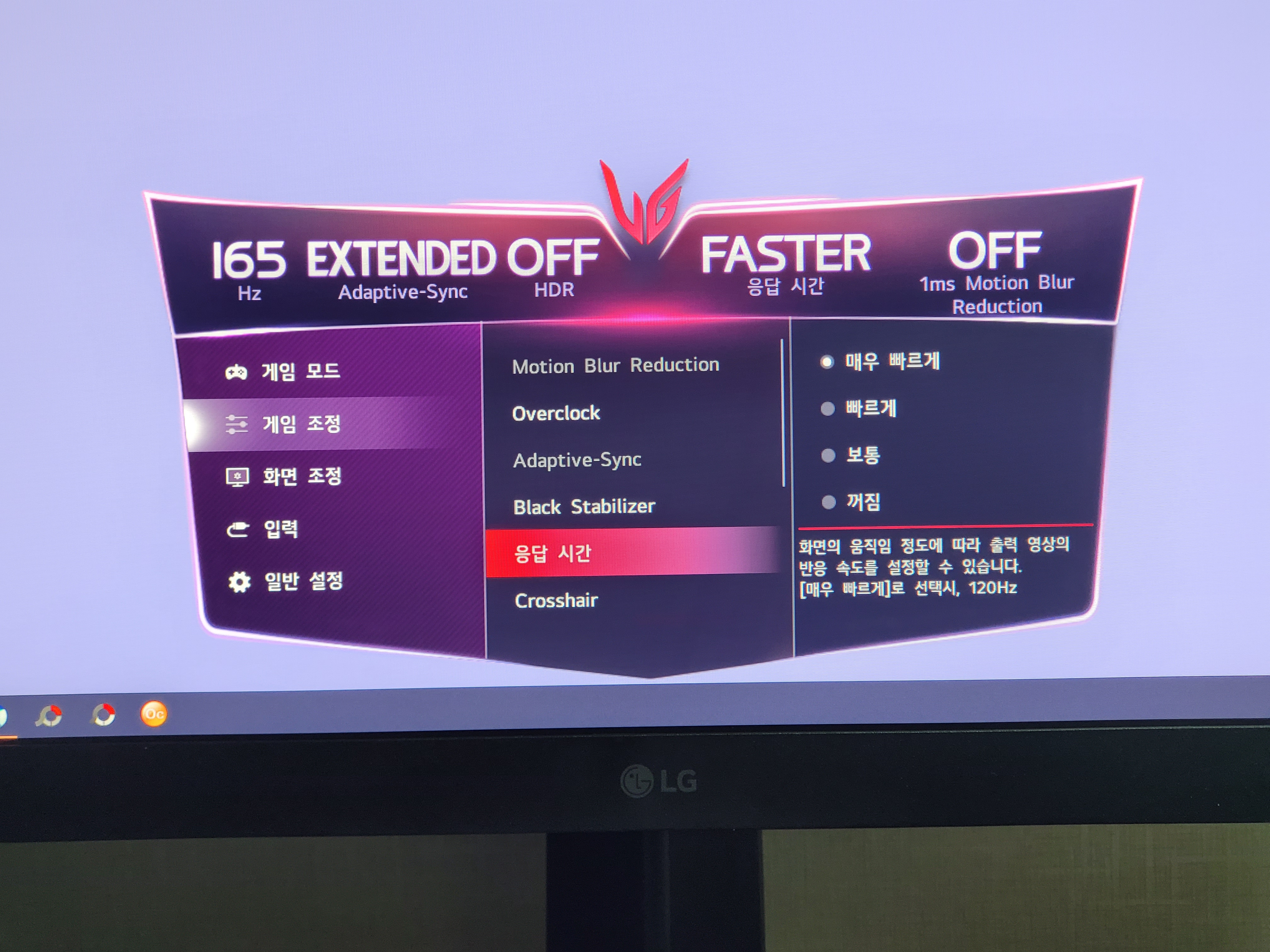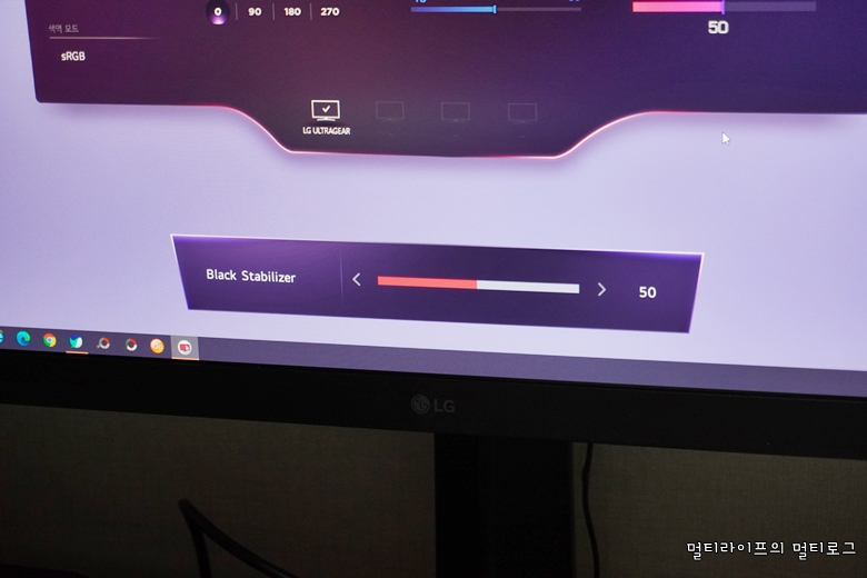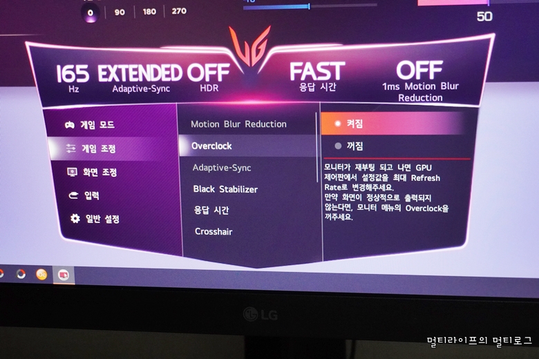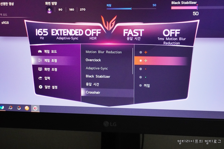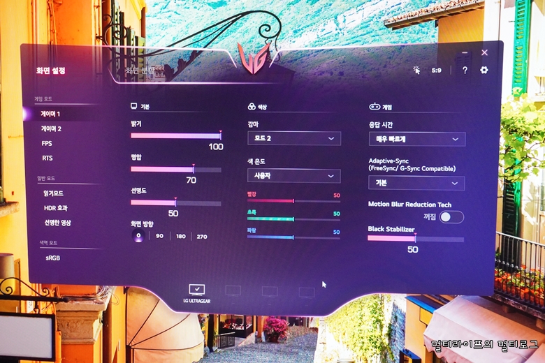 LG전자 홈페이지에서는 온스크린 컨트롤 소프트웨어를 무료로 다운받아 설치할 수 있다. 온스크린 설정을 쉽고 간편하게 할 수 있고 설정 상태를 직관적으로 확인할 수 있어서 편하다. 무엇보다도 디자인이 게이머 친화적이라는 것이다. 보라빛에 UG 엠블럼이 있는 디자인은 울트라기어 게이밍 모니터와 아주 잘 어울린다.