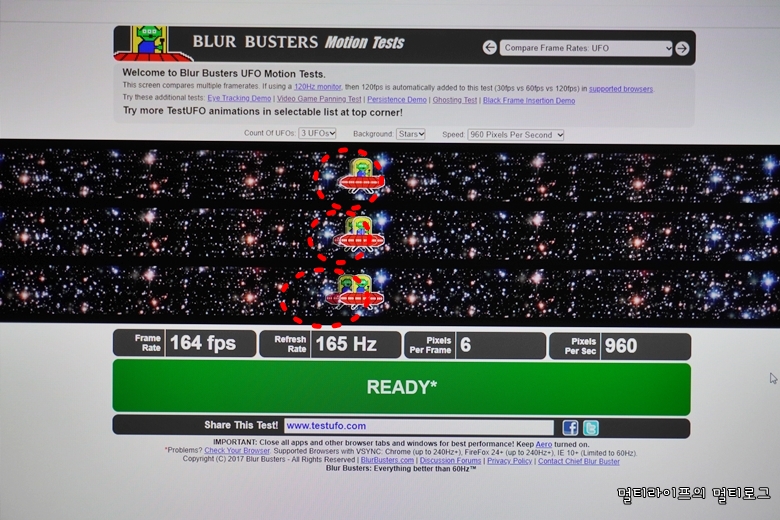 UFO 테스트를 통해 주사율 테스트를 진행해보았다. 제일 상단이 164fps로 잔상이 거의 없음을 알 수 있다. 주사율이 낮으면 낮을수록 잔상이 많이 남고 번짐이 심한데 164fps의 UFO를 보면 꼬리잔상이 길지 않고 확실히 표현되는 것을 알 수 있다. 제일 아래의 41fps의 경우에는 잔상과 번짐이 심하다는 걸 알 수 있다. 두번째 줄과 세번째 줄에 나타난 UFO처럼 저가형 패널의 경우에는 꼬리도 길고 잔상이 흐리게 표현되는 경우가 많은데 LG 울트라기어 게이밍 모니터 32GP850에서는 그런 표현을 찾아볼 수 없다. 쉽게 설명하자면 주사율은 1초에 재생할 수 있는 프레임 개수를 뜻하며 165Hz는 1초에 165 프레임을 재생할 수 있다는 것이고 빠른 화면전환과 많은 움직임이 있는 게임에서는 게임 화면을 그만큼 부드럽게 표현할 수 있다는 것이다. 즉, 높은 주사율은 화면이 찢어지거나 버벅거림이 없기에 몰입감이 커지고 승률에도 좋은 영향을 줄 수 있다.