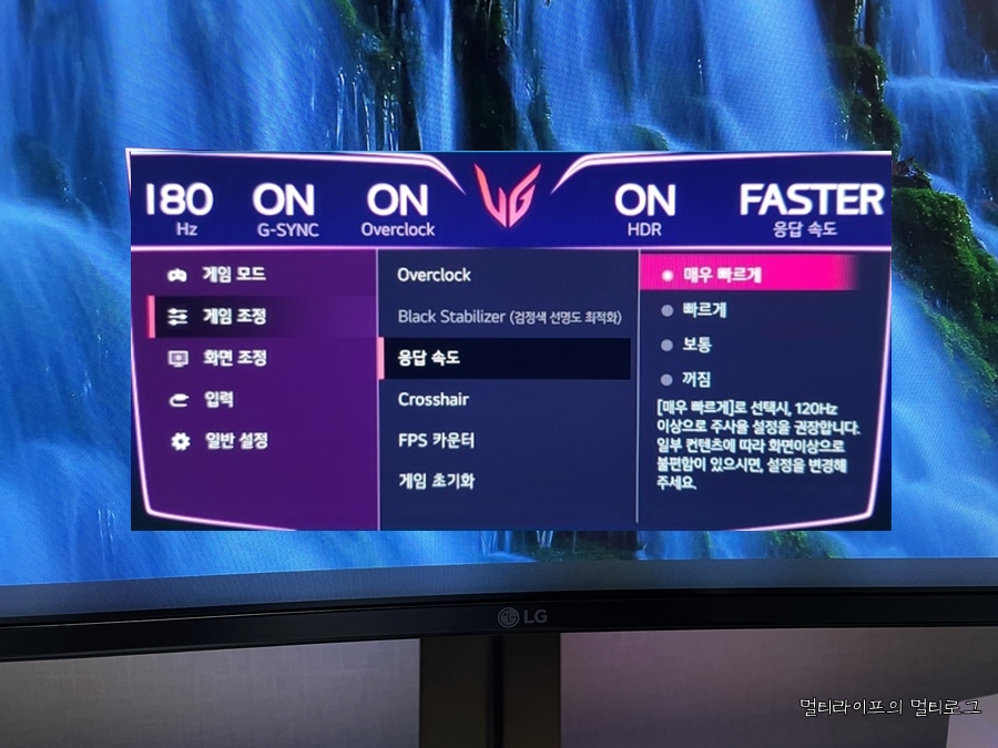 * 응답속도를 [매우 빠르게]로 세팅 시, 120Hz 이상 설정하여 사용을 권장합니다. 시청하는 일부 컨텐츠에 따라 잔상이 발생할 수 있으나, 응답속도를 [빠르게]로 설정하시면 증상이 해소될 수 있습니다.
