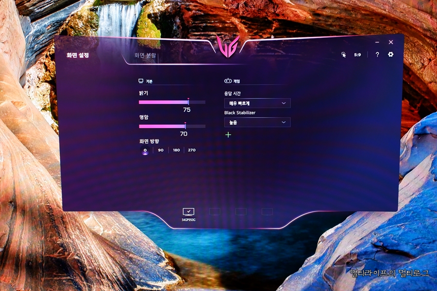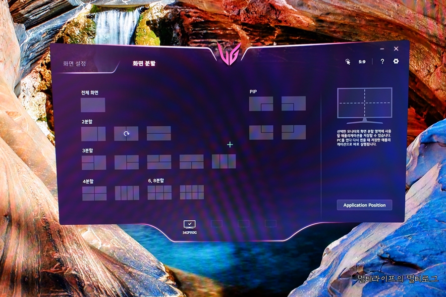 LG 울트라기어 34GP950G는 34형 21:9 화면비가 특징이기에 멀티태스킹 작업 시 화면 활용이 용이하다. 특히 화면을 분할해서 사용해야 할 때는 LG 온스크린 컨트롤 소프트웨어를 설치해서 사용하면 좋다. 다양한 레이아웃으로 화면 분할을 설정할 수 있고 밝기, 명암 등을 조절할 수 있으며 2분할, 3분할, 4분할 PIP 화면을 쉽게 설정할 수 있다.
