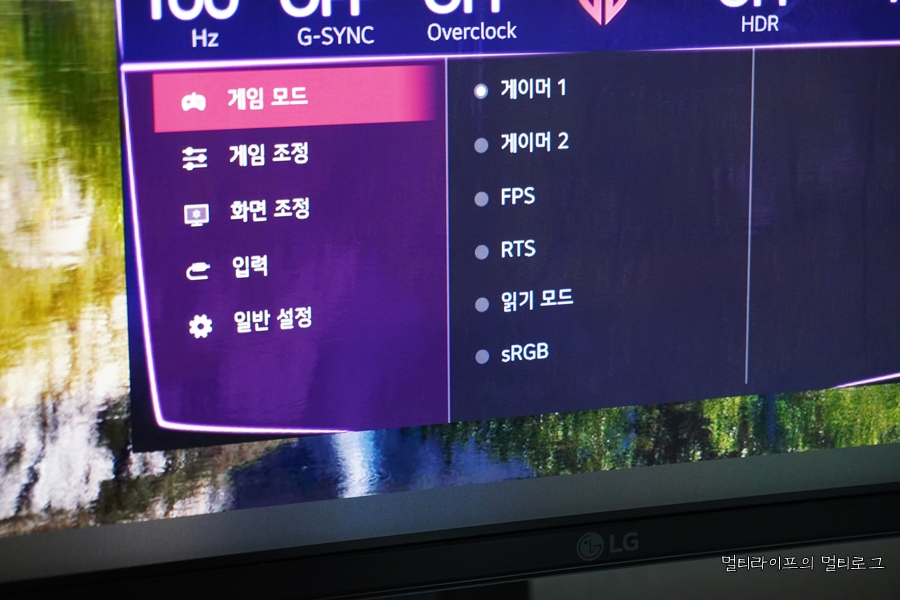 메뉴로 들어가면 게임 모드를 게이머 개인 취향이나 플레이 중인 게임 장르에 맞춰 변경할 수 있다. 화면 색감, 주사율, G-SYNC, HDR, 응답속도 등을 손쉽게 설정할 수 있다.