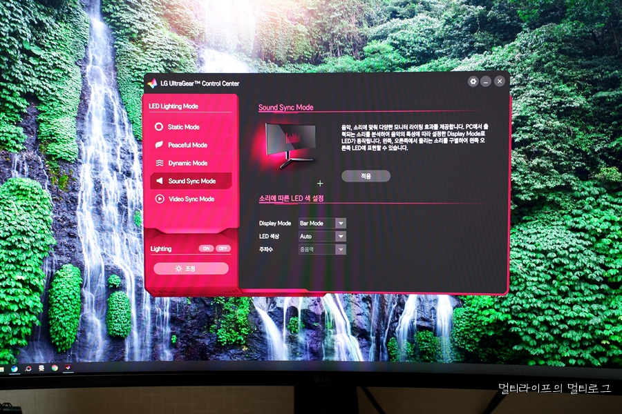 또한 보다 게이밍스러운 분위기를 연출하고 싶을 때는 LG 울트라기어 컨트롤센터 소프트웨어를 설치하면 더 멋진 위닝포스라이팅 조명 효과를 적용할 수 있다. Static Mode, Peaceful Mode, Dynamic Mode, Sound Sync Mode, Video Sync Mode 총 5가지 모드 중에서 원하는 모드를 선택하면 된다. 필자는 소리에 따라 조명이 변경되는 사운드 싱크모드를 적용했다.