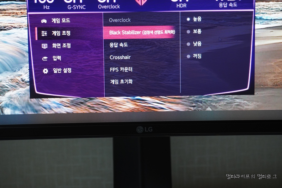 게이밍 모니터 답게 게이머 편의를 위한 특화 기능도 마련되어 있다. 하단 중앙에 있는 버튼을 누르면 게이밍 GUI를 만나게 된다. 간편하고 직관적으로 게임모드를 설정할 수 있다. 메뉴를 들어가지 않고서도 쉽게 게임모드 변경이 가능하다는 것도 상당히 편리하다.