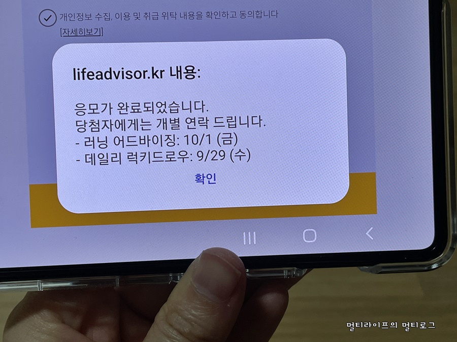 응모하기 버튼을 누르면 응모가 완료되었다는 팝업창이 뜨고 당첨자에게는 개별연락을 준다는 글을 확인할 수 있다. 데일리 럭키드로우는 이벤트 당일 응모완료자를 대상으로 진행되는데 한정판 운동화&애플워치 득템의 기회가 주어진다. 데일리 럭키드로우만 당첨이 된다면 이 또한 기쁠 일이기도 하다. 한 때 달리기에 미쳐서 어떤 마라톤에 도전해볼까 고민을 했었는데 이제는 그런 체력은 없지만 그래도 도전은 해보고 싶다는 생각을 한다. 마라톤완주에 필요한 다양한 러닝 스킬을 전문가들로부터 코칭을 받는다면 3년전 참여했던 10km 마라톤 완주처럼 지금도 해낼 수 있을 것도 같다. 나의 러닝 고민을 해결하고 2021 마라톤완주까지 해보고 싶다면 한화생명 라이프플러스 라이프어드바이저 캠페인에 참여해보자. 신청은 글 본문 중간에 있는 QR코드를 검색해도 되고, 하단의 링크를 클릭해도 된다.