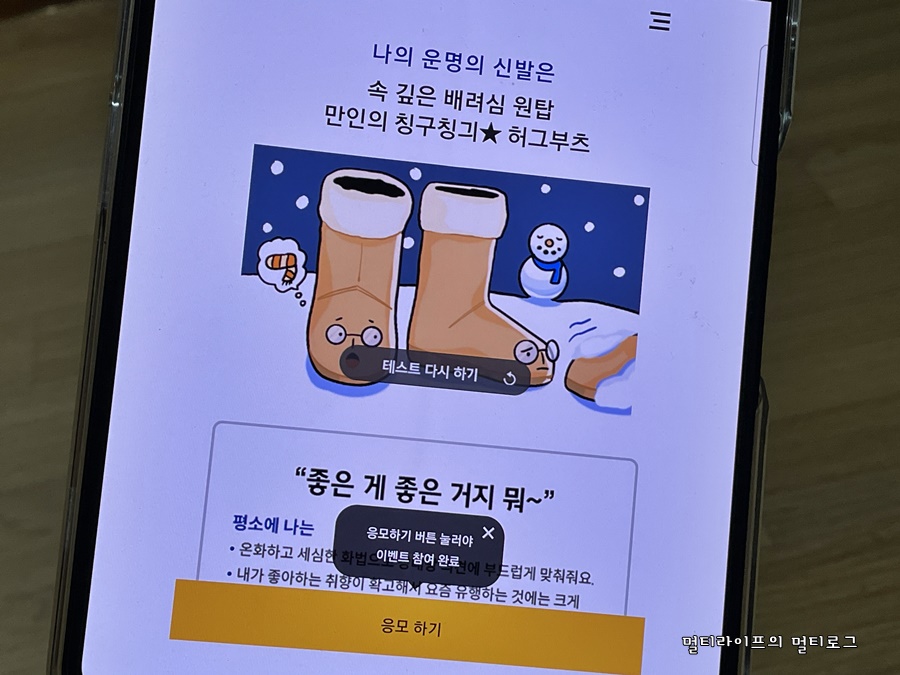 테스트를 마치고 나니 나의 성향은 속 깊은 배려심 원탑, 만인의 친구인 허그부츠가 나왔다. 지압슬리퍼나 군화가 안나와서 다행이라 해야하는걸까? 다른 사람들의 테스트 결과도 상당히 궁금해지기 시작했다. 그리고 결과를 확인하고 나서는 하단의 응모버튼을 클릭을 했다. 결과 확인 후에는 반드시 응모하기 버튼을 누르는 것을 잊지 말자. 응모하기 버튼을 눌러야만 이벤트 참여가 된다.