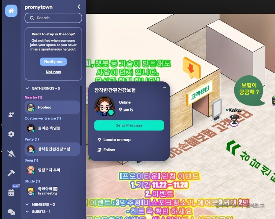 두 번째 이벤트는 메타버스 플랫폼 게더타운에서 펼쳐진다. 메타버스를 제대로 느낄 수 있는 이벤트라 할 수 있다. 게더타운 <프로미타운>에 접속하면 OX퀴즈, 미로찾기 등 4주간 매주 달라지는 이벤트에 참여하고 경품을 받을 수 있다. 삼성 비스포크 슬림 청소기 4명과 애플 에어팟 3세대 8명, 배스킨라빈스 싱귤레귤러 577명에게 선물을 준다하니 서둘러 참여해보았다.