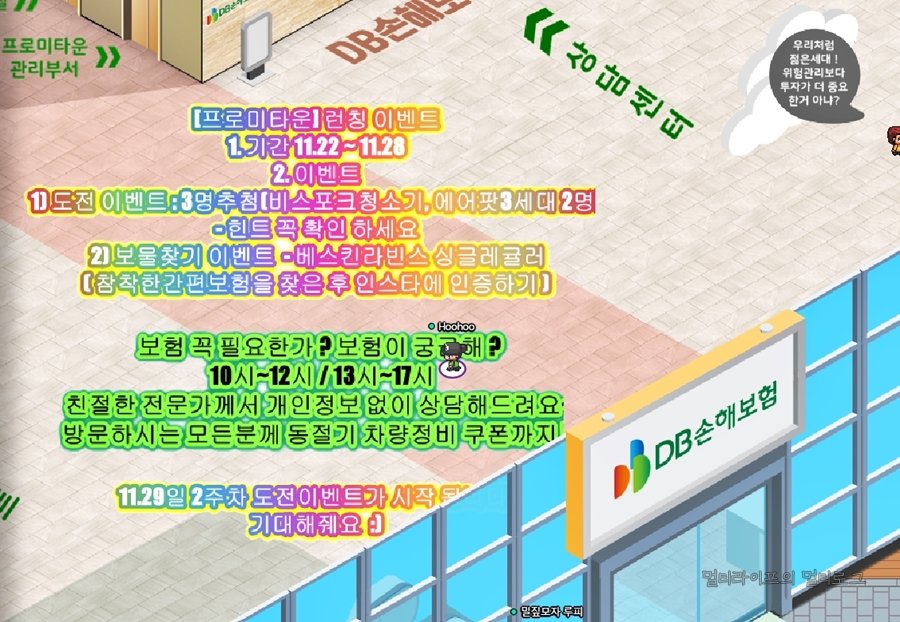 입구에는 방명록이 있고 자동문을 통과하면 DB손해보험에 들어가게 된다. 프로미타운 런칭 이벤트 1차는 11월 28일까지, 2주차 도전이벤트는 11월 29일에 시작되는데 필자가 접속한 때는 1주차 도전이벤트가 진행되고 있었다. 그리고 10시에서 12시, 오후 1시부터 5시까지는 전문가가 개인정보 없이 상담해주고 방문하는 모든 이들에게는 동절기 차량정비 쿠폰까지 증정하니, 시간적 여유가 된다면 상담 받는 것을 추천한다. 개인정보 없이 상담해준다는 점이 상당히 마음에 들었고 상담 받을 때도 상당히 마음이 편안하다.