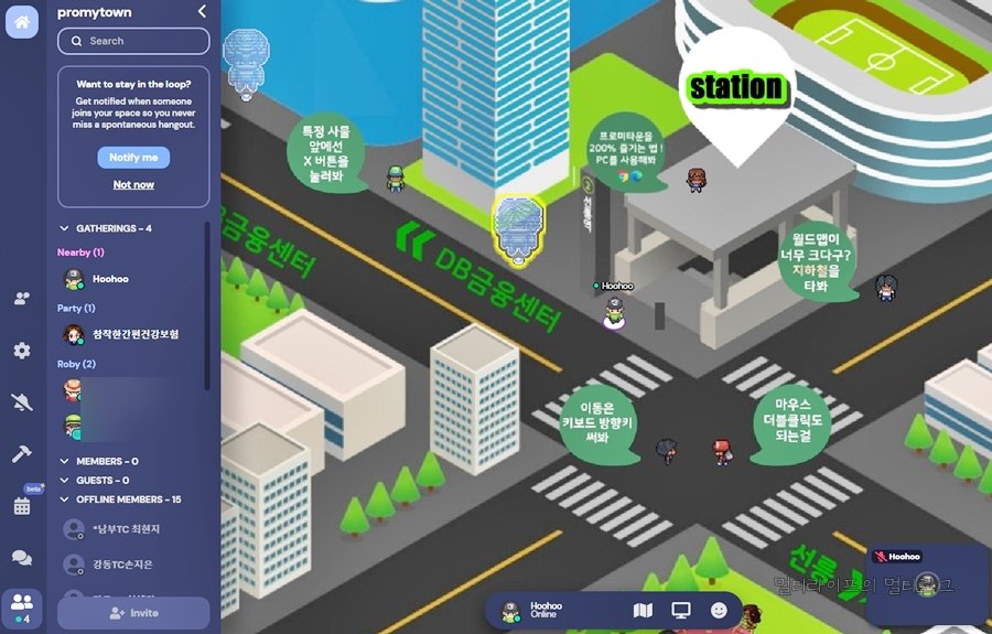 게더타운은 별도의 앱을 설치하지 않고 크롬 혹은 사파리 등 웹 브라우저를 통해 접속이 가능하다. 게더타운 속에 마련된 DB손해보험 프로미타운은 PC 환경에서 접속하는 게 좋고 모바일 환경에서는 일부 서비스 제약이 있다. PC 접속 가능 브라우저는 크롬과 엣지, 모바일 접속 가능 브라우저는 크롬과 사파리다.
