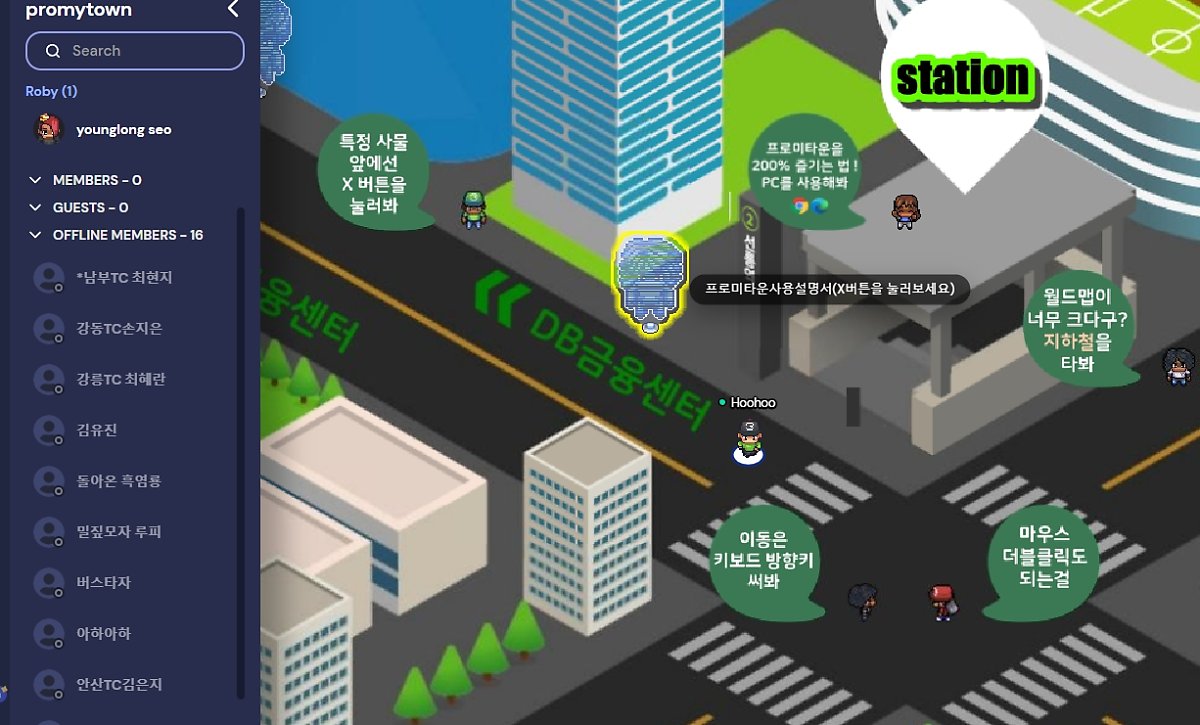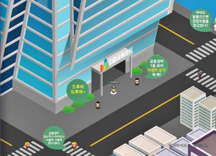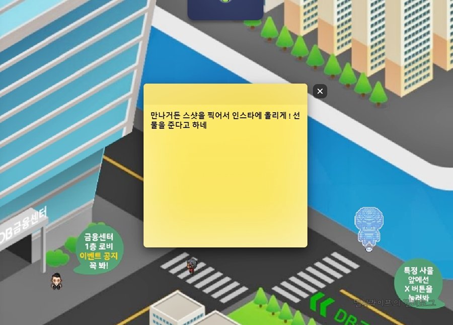 게더타운속 선릉역 입구에서 DB금융센터를 찾아가면 이벤트에 한걸음 가까이 다가간다. 참, 방향키와 마우스를 이용해서 이동을 쉽게 할 수 있다. 초록색 <<DB금융센터 화살표를 따라가면 금방 찾을 수 있다. 참고로 키보드의 G버튼을 누르면 고스트모드로 다른 사람과 커뮤니케이션은 불가하며 Z버튼을 누르면 댄스모드, X버튼은 상호작용이다.