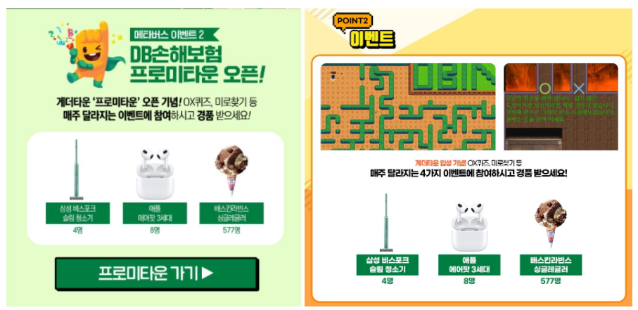 편의점상품권과 아이스크림, 바나나우유를 제공하는 룰렛돌리기 이벤트와 삼성 비스포크청소기, 애플 에어팟 3세대를 추첨을 통해 증정하는 게더타운 참여이벤트, 다이슨 드라이어, 애플 에어팟 3세대를 추첨을 통해 증정하는 제페토 SNS 인증샷 이벤트까지 DB손해보험이벤트는 아주 풍성했다. 이벤트 기간은 2021년 11월 22일부터 12월 17일까지니 기간안에 이벤트에 응모해보라 말하고 싶다.