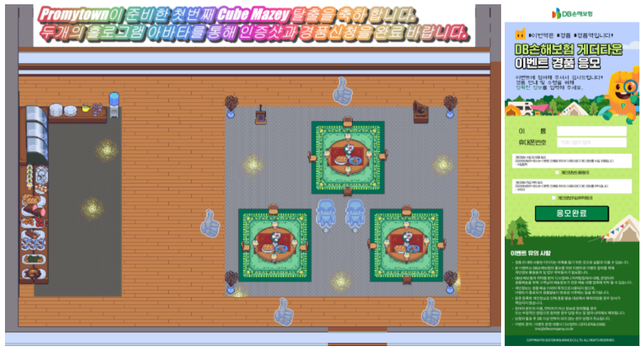 한 시간 정도 미로와의 싸움 끝에 미로찾기 게임을 클리어했다. 게임 클리어 창이 나타나면 홀로그램 아바타를 통해서 인증샷과 경품 신청을 하면 된다. DB손해보험 게더타운 이벤트 경품 응모 창에 이름과 휴대폰를 입력하고 개인정보 이용동의에 체크를 하고 응모완료 버튼을 누르면 끝난다. 이벤트는 매주마다 바뀌니 매주마다 새로운 게임을 하는 즐거움도 느낄 수 있다.