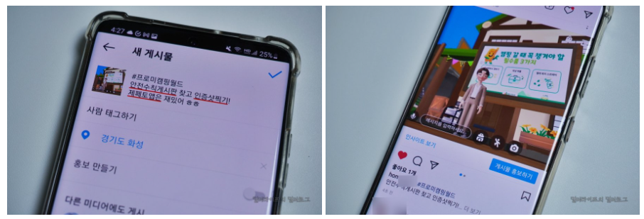 가장 중요한 것은 셀카를 찍고 끝내는 게 아니라 인스타그램에 #프로미캠핑월드 해시태그와 함께 공유해야 한다는 것이다. 맵 곳곳에 흩어진 안전수칙 표지판과 함께 셀카를 찍고 인스타그램에 해시태그를 하고 게시하면 경품에 응모되니 꼭 응모해보자!