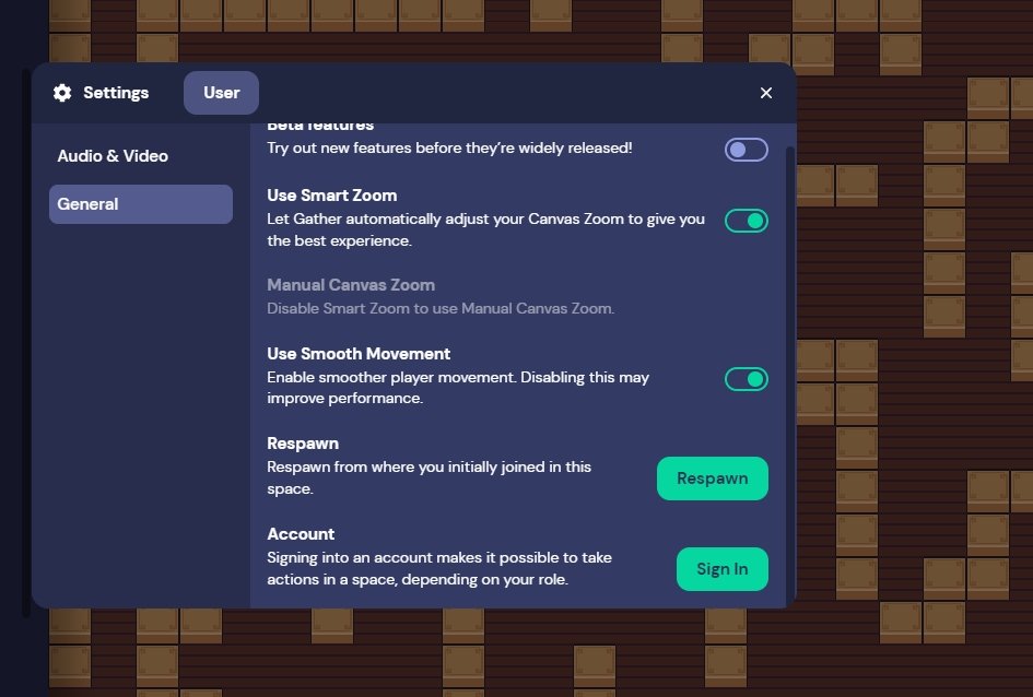 그리고 팁을 하나 주자면 프로미타운에서, DB금융센터 안에서 길을 잃었을 때 처음에 게더타운에 접속했던 선릉역으로 돌아가는 방법이 있다. 왼쪽 파란색 창에서 설정을 누르고 일반메뉴(General)을 클릭한 후 리스폰(Respawn)을 클릭하면 처음에 시작했던 선릉역으로 돌아가게 된다.