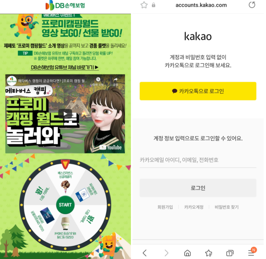 로그인을 하고 난 후 제페토 앱 내 DB손해보험 월드인 프로미 캠핑월드를 소개하는 <프로미 캠핑월드> 영상을 시청하면 되는데, 팁을 주자면 DB 손해보험 유튜브 채널을 구독하면 당첨 확률이 올라간다. 여기서 프로미 캠핑월드 영상을 집중해서 시청하길 바란다. 그 이유는 3번째 이벤트와 연결이 되기 때문이다.