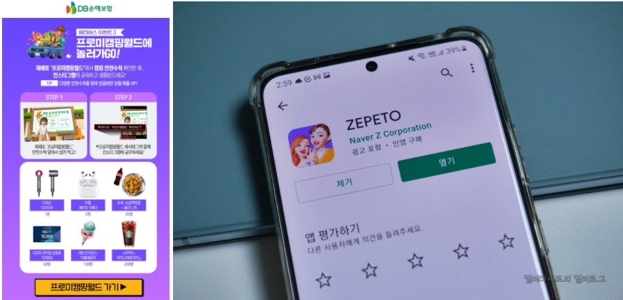 DB손해보험이벤트는 아직 끝나지 않았다. 마지막으로 세번째 이벤트가 남아있다. 세번째 이벤트는 첫번째 룰렛 돌리기 이벤트와 관련이 있는데, 프로미 캠핑월드 영상을 제대로 시청했다면 세번째 이벤트 참여는 아주 쉽다. 메타버스 이벤트 세 번째를 진행하기 위해서는 제페토 앱 설치와 인스타그램 계정 업로드라는 과정이 필요하다. 다이슨 드라이어, 애플 에어팟 3세대, BHC 순살뿌링클+콜라, GS25 모바일상품권, 배스킨라빈스 더블레귤러, 스타벅스 아이스아메리카노 등 푸짐한 상품이 기다리고 있으니 망설일 것은 없었다.