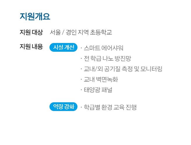 맑은학교 만들기 캠페인을 통해 학교에는 태양광 발전설비가 설치되고 미세먼지 발생없이 만들어진 전기를 학교가 사용하게 된다. 학교 출입구에는 스마트 에어샤워를 설치해 등교길에 묻은 먼지와 바이러스를 제거하고 창문에는 나노 방진망을 설치해서 언제든 환기가 가능하고 미세먼지 유입을 막아주는 안전한 학습환경을 만들고자 하는 것이다. 또한 학교와 교실 벽면 곳곳에는 녹화를 조성해서 식물들을 아이들이 가까이서 접할수 있게 하고 교내, 외에는 공기질 측정을 하고 모니터링을 통해 공기질 관리를 한다.
