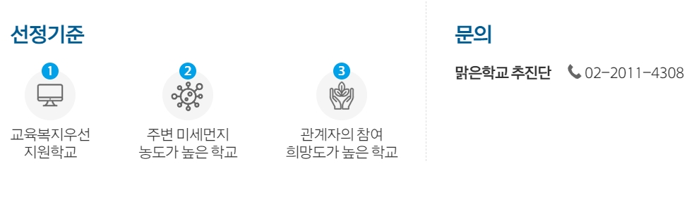 맑은학교 만들기 캠페인의 지원대상은 서울과 경인 지역의 초등학교이며 교육복지 우선지원학교, 주변 미세먼지 농도가 높은 학교, 관계자의 참여 희망도가 높은 학교 등의 기준으로 선정된다. 신청서 제출기한은 2022년 1월 14일까지이며 신청서 다운로드 등 더 자세한 사항은 하단의 맑은학교 만들기 캠페인 링크를 참고하면 되겠다.