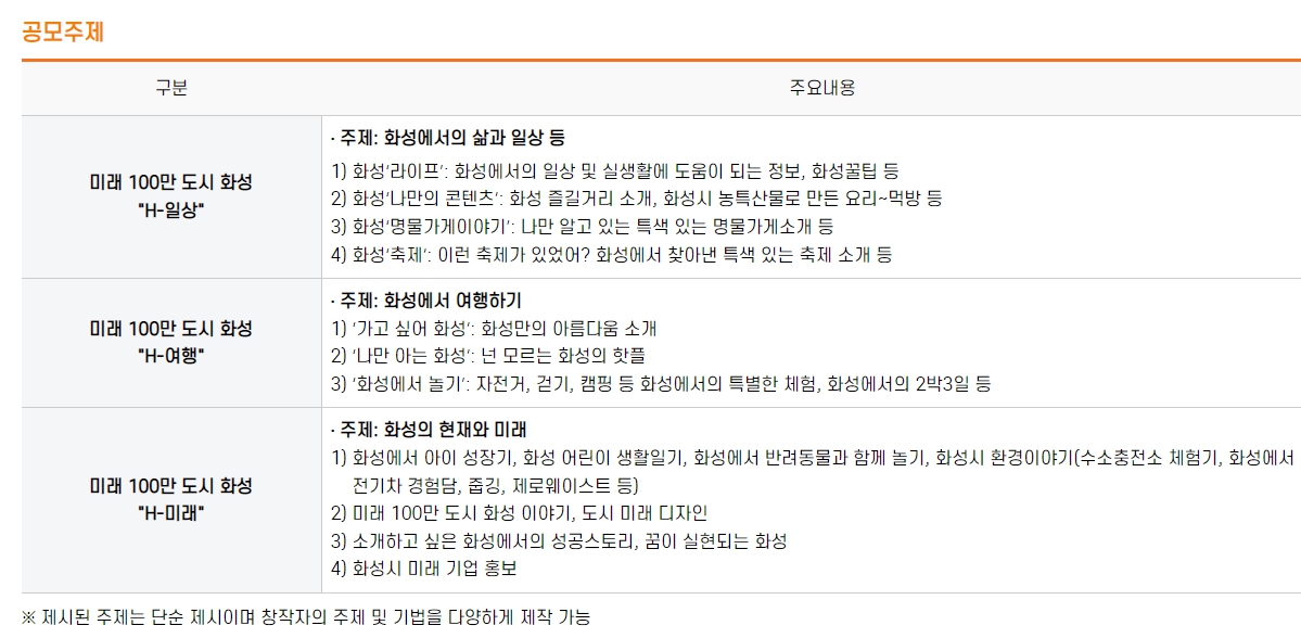 공모주제는 화성에서의 삶과 일상, 화성에서의 여행하기, 화성의 현재와 미래로 구분된다. 공모주제의 내용에 제시된 것은 단순 제시이며 창작자의 주제 및 기법을 다양하게 제작이 가능하기에 상상력과 창의력을 콘텐츠로 마음껏 발휘하면 된다. 화성시의 명소를 찾아내는 눈썰미, 숨겨뒀던 기획력과 참신한 아이디어 모두 다 뽐내면 된다.