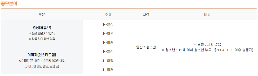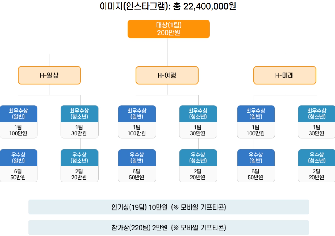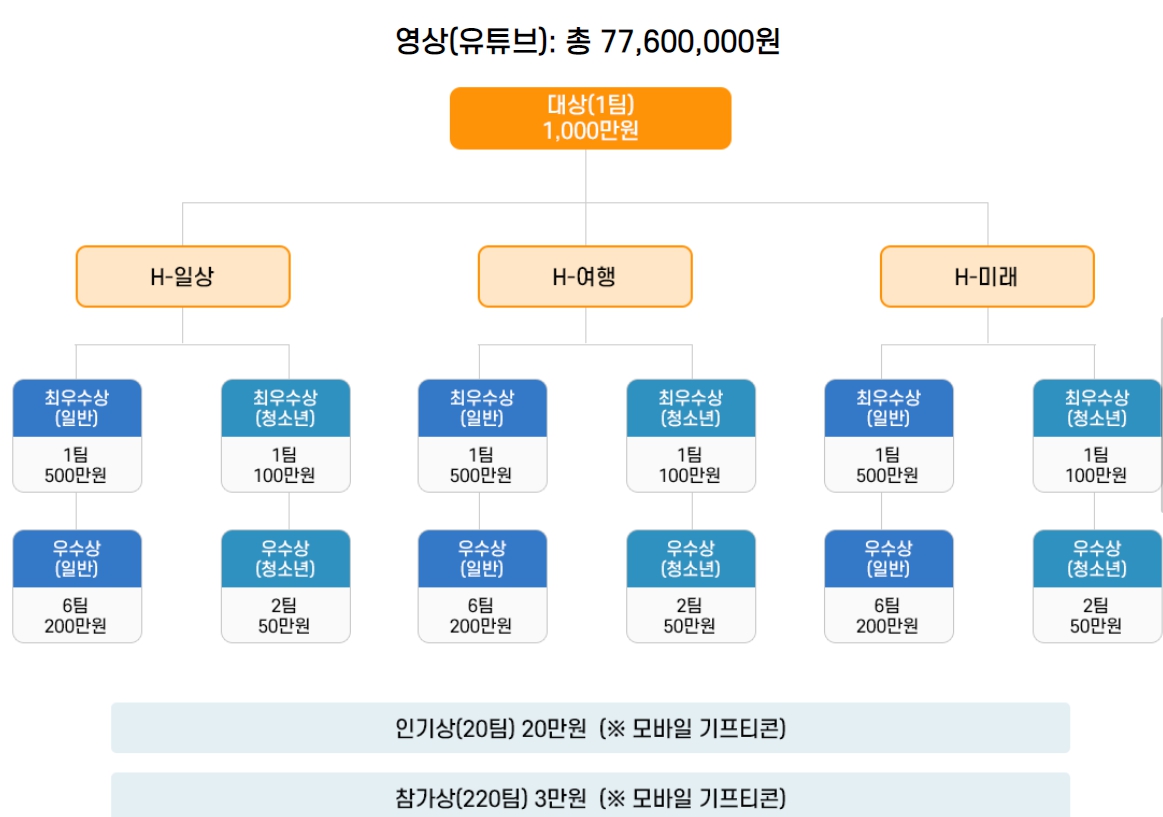 유튜브 영상 대상 1팀에게는 1,000만원, H-일상과 H-여행, H-미래 분야에서 각 1팀은 최우수상을 받게 되는데 상금은 각 500만원씩 받게 되며 우수상 6팀은 200만원의 상금이, 청소년분야의 최우수상 1팀은 100만원, 우수상 2팀 50만원 상금이 있다. 인스타그램 이미지 대상 1팀에게는 상금 200만원이 돌아가며 일반 분야 최우수상 1팀에게는 각 100만원, 우수상 6팀에게는 50만원, 청소년 분야 최우수상 1팀은 30만원, 우수상 2팀에게는 20만원의 상금이 주어진다. 앞에서도 덧붙였지만 부문별, 주제별 출품 횟수는 제한이 없지만 중복 수상은 불가하다는 점은 알아둬야 한다.