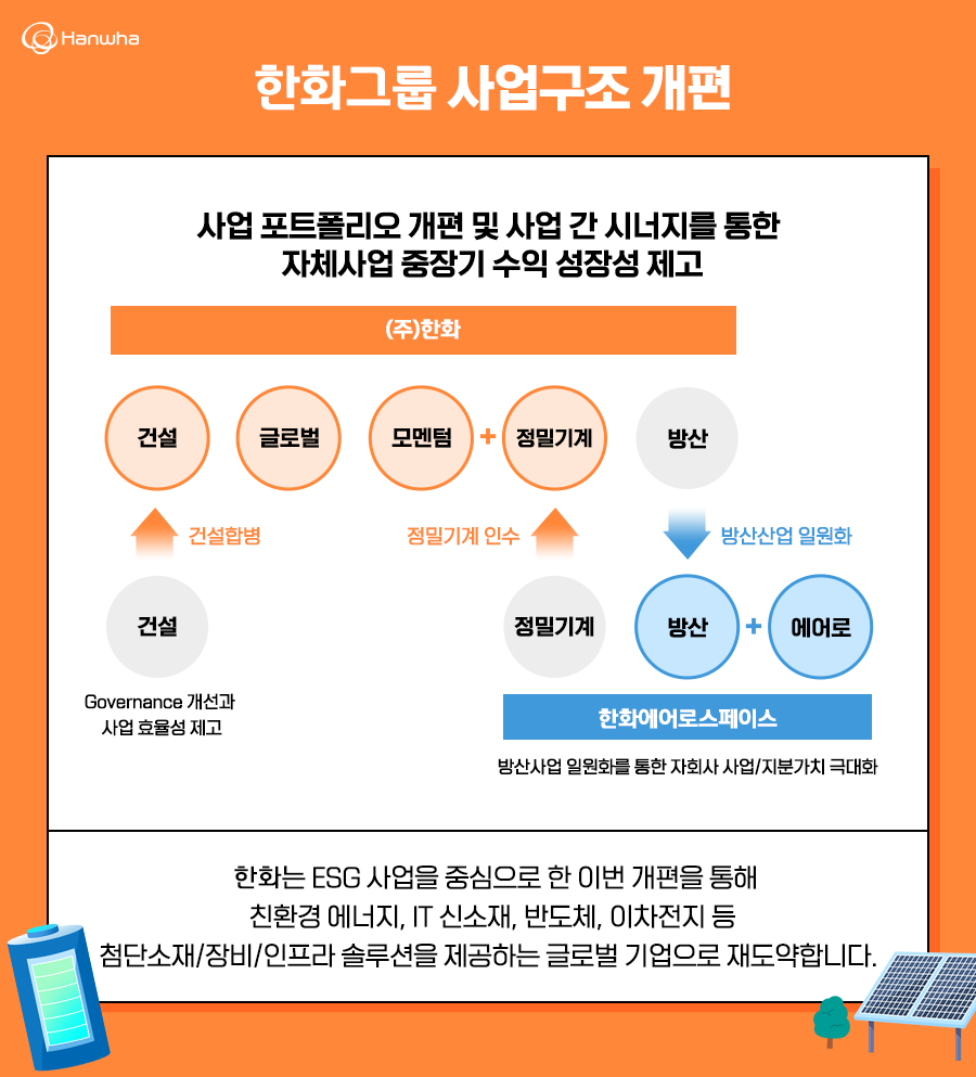 요즘 기업에 투자하기전에 고려되는 비재무적요소인 ESG에 대한 관심이 높다. ESG는 기업의 지속 가능 경영을 나타내는 척도로 자원절약과 재활용, 기후변화대응 등의 환경보호활동(Environment), 사회적 약자지원, 노동환경 개선 등의 사회공헌활동(Social), 법과 윤리를 준수해 투명하게 기업을 운영하는 지배구조(Governance)를 뜻한다. (주)한화는 마치 ESG가 체질인듯 사업개편을 통해 미래 고수익 친환경 사업으로 전환했다. 한화그룹의 모태가 되는 (주)한화는 글로벌, 모멘텀, 방산 부문 3개 사업 부문으로 구성되었는데 이번 사업개편에서 (주)한화의 방산을 한화 에어로스페이스로 매각해 글로벌, 모멘텀, 건설 이렇게 3개 사업 부문으로 구성될 예정이다.