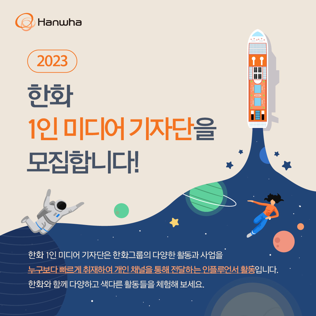 2023 한화 1인미디어 기자단은 총 15명을 모집하고 월 1회 이상 진행되는 오프라인 활동(정기모임, 취재)에 참여가 가능해야 한다. 모집 기간은 2023년 2월 10일부터 2월 26일까지 이며 발표는 2023년 3월 8일 수요일, 발대식은 2023년 3월 15일 수요일로, 한화 1인 미디어 기자단으로 합격하면 발대식 참여는 필수다.