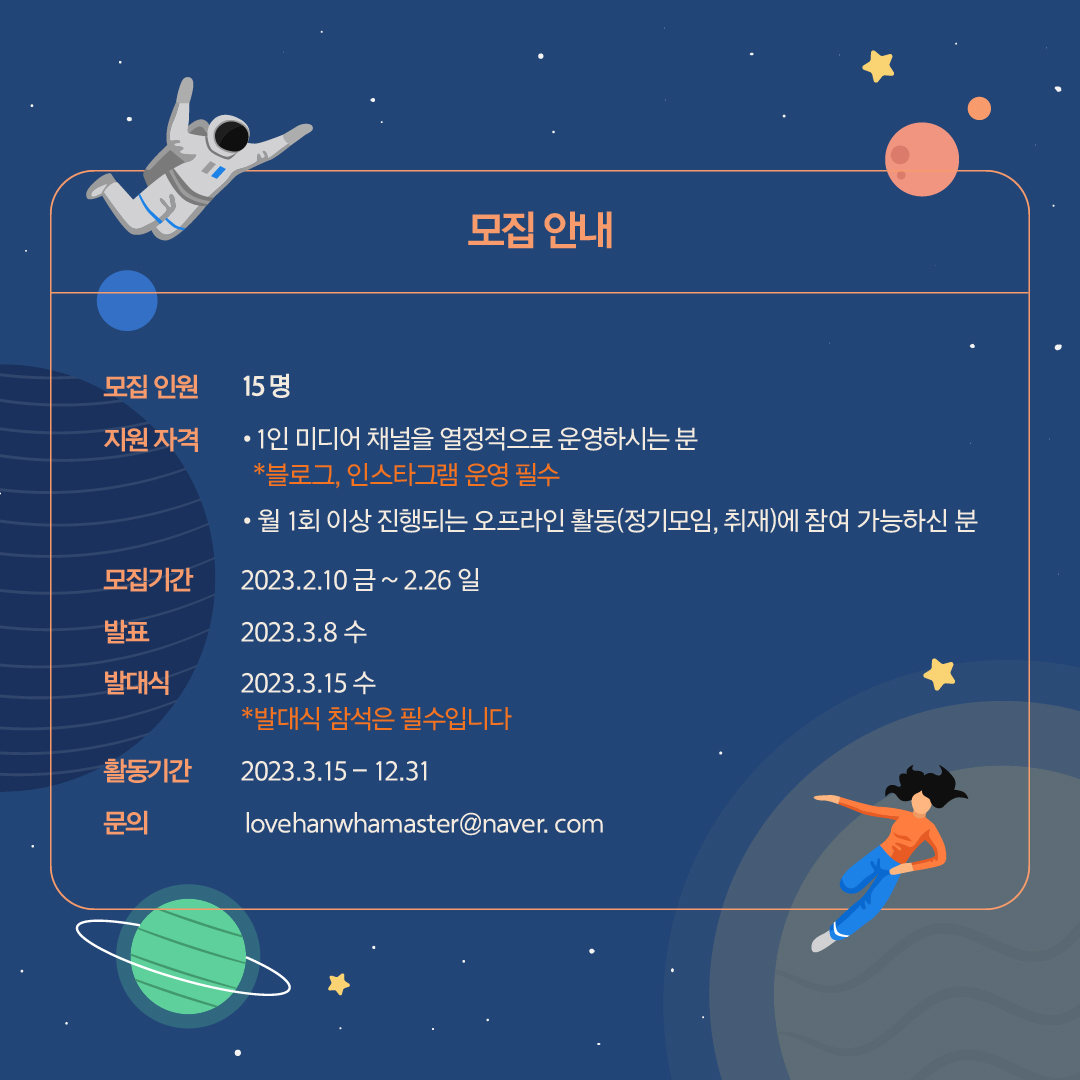 자세한 내용은 모집 공고를 확인해주세요. https://cafe.naver.com/hanwhaclub/19992