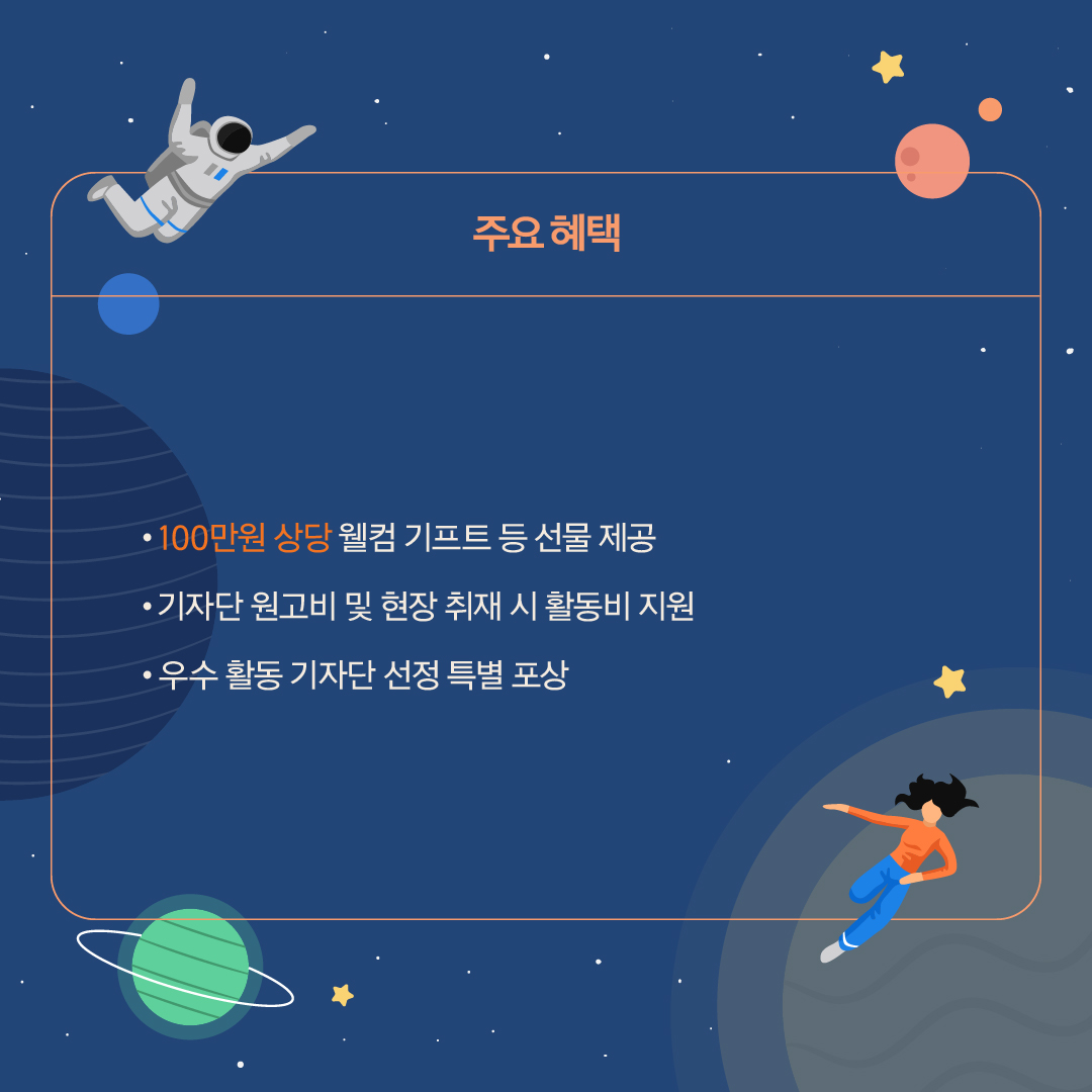 주요 혜택은 100만원 상당 웰컴 기프트 등 선물을 제공하고 기자단 원고비, 현장 취재 시 활동비도 지원한다는 것이다. 그리고 우수 활동 기자단을 선정해 특별 포상도 한다. 올해 우수 활동 기자단의 특별포상은 어떤 상품인지도 궁금하기도 하다.