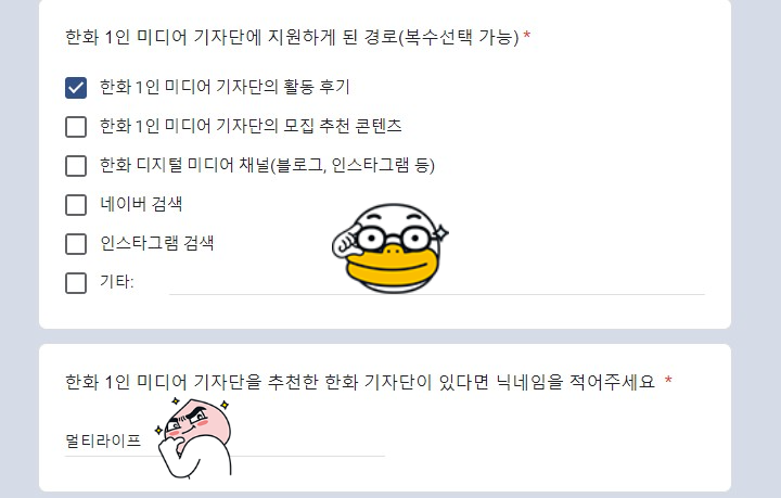 참고로 필자는 한화 1인 미디어 기자단 OB로 활동하고 있는데, 이 글을 읽고 한화 1인 미디어 기자단에 지원하고 싶어졌다면 필자의 닉네임을 적어도 좋다. 한화 1인 미디어 기자단에 지원하게 된 경로에서 "한화 1인 미디어 기자단의 활동후기"를 체크하고, 한화 기자단 닉네임에 "멀티라이프"를 적으면 된다. 2023 한화 1인 미디어 기자단 지원서는 하단 폼을 클릭하고 작성하면 된다.