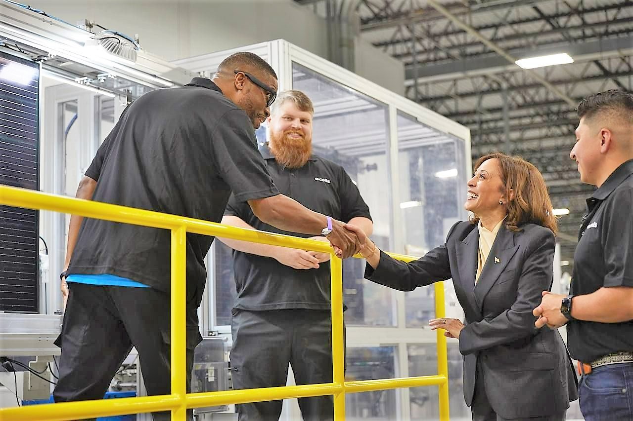 바이든 행정부는 3월부터 20여개 주에서 입법 성과를 알리는 '인베스트 인 아메리카' 투어를 진행하고 있는데, 신재생 에너지 부문 일자리 창출과 투자 확대 모범 사례를 한화솔루션 달튼 공장으로 꼽은 것이다. 해리스 부통령은 바이든 행정부가 미국 역사상 최대 규모의 태양광 에너지 투자 계획을 이끌어냈고 달튼이 미국 최대 태양광 모듈 공장의 기지가 되었고 달튼 공장에서 세계 최고 수준의 모듈이 생산되고 있다 연설했다.