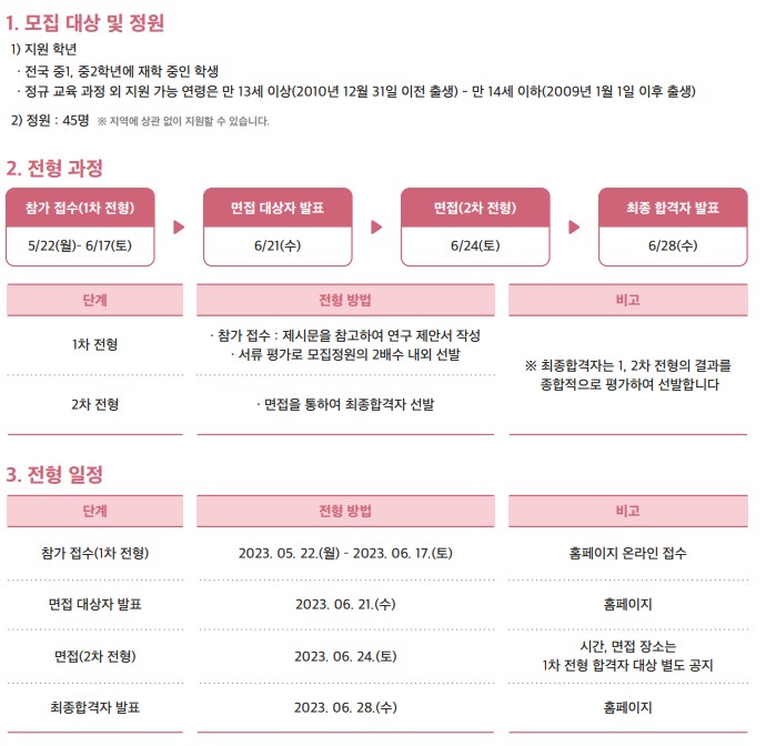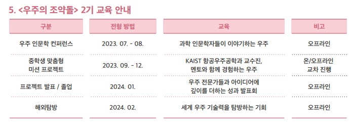 그리고 2023년 5월 22일부터 6월 9일까지는 우주영재교육2기, 우주의 조약돌 2기를 모집하고 있다. 이번 우주의 조약돌 2기의 주제는 "화성탐사"다. 우주에 관심있는 중학교 1, 2학년 학생은 지역 상관없이 누구나 신청할 수 있는 교육프로그램으로 올해는 기존 30명에서 45명으로 15명이나 많이 뽑는다. 과학영재교육이라해서 과학고를 희망하는 학생들만 할 수 있는 건 아니며 우주에 관심있는 중학교 1, 2학년 학생 모두가 가능하다.