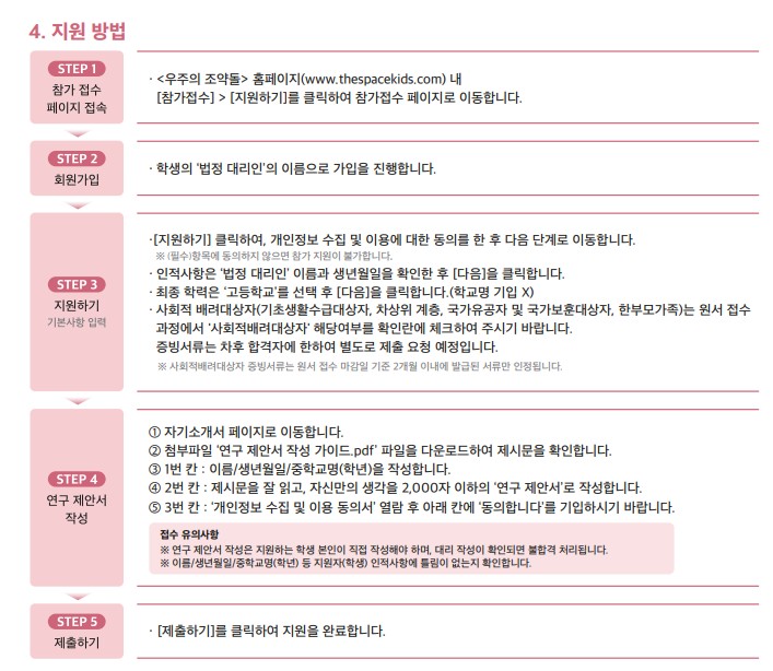 지원방법은 우주의 조약돌 홈페이지에 지원하기를 클릭해서 참가 접수 페이지에서 하면 되는데 최원가입은 학생의 법정 대리인의 이름으로 가입을 진행한다. 인적사항은 법정 대리인의 이름과 생년월일을 확인하고, 최종학력은 학교명을 기입하지 않는다. 사회적 배려대상자는 원서 접수 과정에서 사회적배려대상자 해당여부를 확인란에 체크하면 된다.