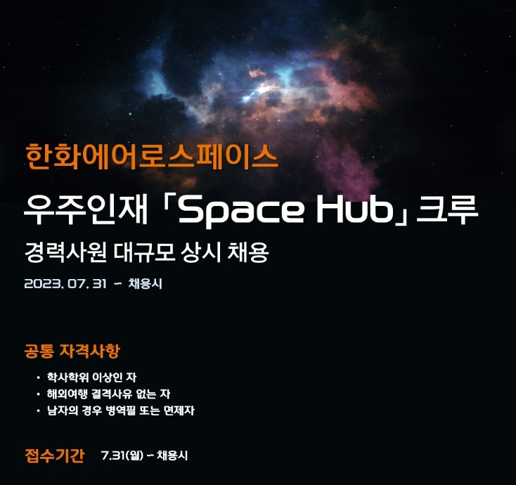 한화에어로스페이스와 한화시스템은 7월 31일 한화 공식 채용 포털인 '한화인'을 통해서 엔진시스템, 연소기설계, 유도 및 자세제어 등 우주산업 10여개 분야에서 신입 및 경력 등 총 000명의 '스페이스 허브 크루' 모집을 밝혔다.