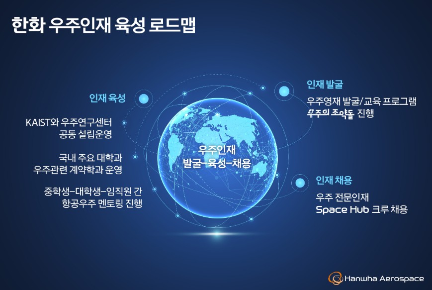 첨단 과학 기술 분야가 집결되는 우주산업의 특성상 다양한 기술 분야에서의 인재 확보는 필수적인데, 한국의 우주 분야 종사 인력은 절대적으로 부족한 편이다. 그렇기에 한화는 인재 확보 뿐만 아니라 미래의 우주인재 육성을 위한 노력도 강화하고 있다.