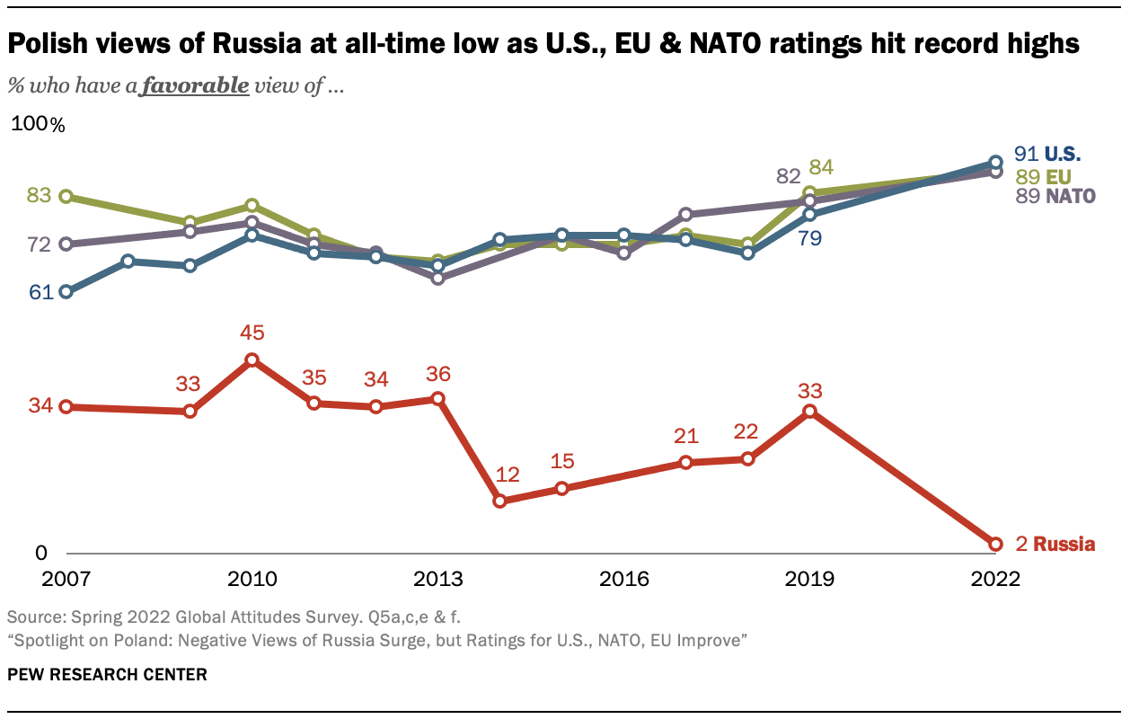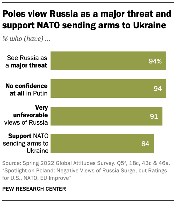 그런데 러시아가 폴란드의 이웃나라인 우크라이나를 침공하니 폴란드 국민들의 불안감은 높아질 수 밖에 없다. 폴란드인의 94%는 러시아가 가장 큰 위협이라 생각하고 폴란드 인의 러시아 우호도는 2%에 불과할 정도로 폴란드 사람들의 러시아 사람에 대한 인식은 아주 안좋아졌다.