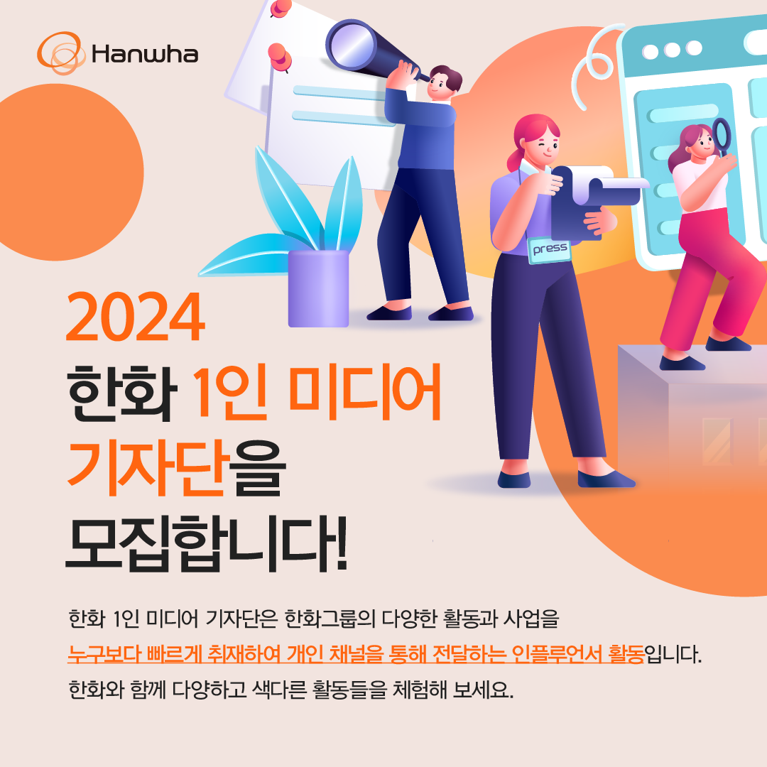2024년 한화 1인 미디어 기자단의 주인공이 될 사람은 총 15명으로, 블로그와 인스타그램 운영은 필수이며 월 1회 이상 진행되는 오프라인 취재 활동이나 정기모임에 참여가 가능해야 한다. 모집 기간은 2024년 2월 5일부터 2월 25일까지로 지원방법은 온라인 지원이다. 발표는 2024년 3월 6일로, 2024년 3월 13일 발대식 참석은 필수다.
