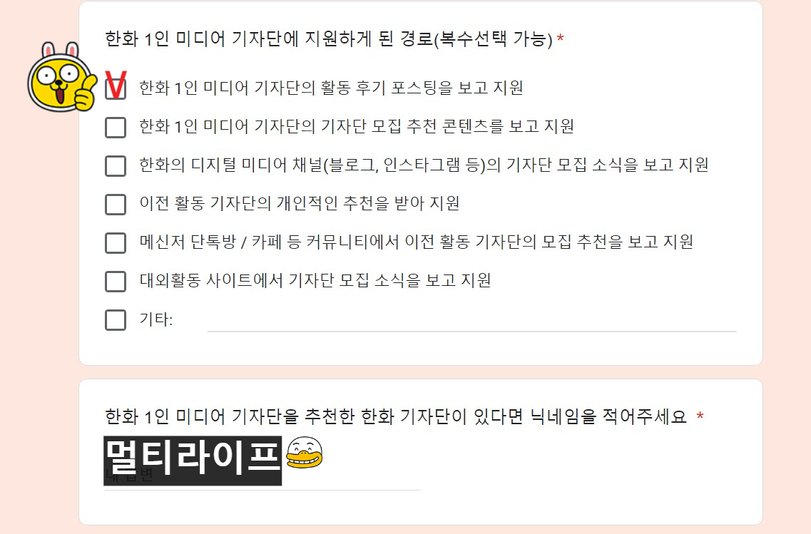 필자는 한화 1인 미디어 기자단 OB로 활동을 이어가고 있다. 이 글을 읽고 한화 1인 미디어 기자단에 지원하고 싶어졌다면 필자의 닉네임 "멀티라이프"를 적어도 좋다. 한화 1인 미디어 기자단 지원입력 폼에서 '지원하게 된 경로'에서 "한화 1인 미디어 기자단의 활동 후기 포스팅을 보고 지원"을 체크하고 한화 기자단 닉네임에 "멀티라이프"를 적으면 된다.