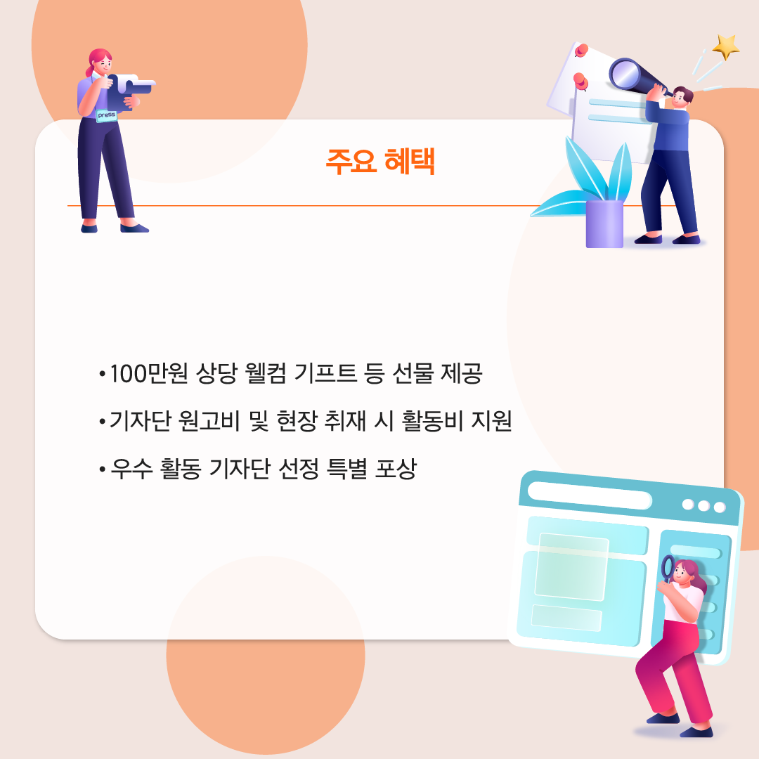 주요 혜택이 남다른데, 100만원 상당의 웰컴기프트 등 선물을 제공하고 기자단 원고비와 현장 취재 시 활동비를 지원하고 우수 활동 기자단을 선정해 특별 포상까지 한다. 특별 포상은 누구나 만족할만한 리워드다.