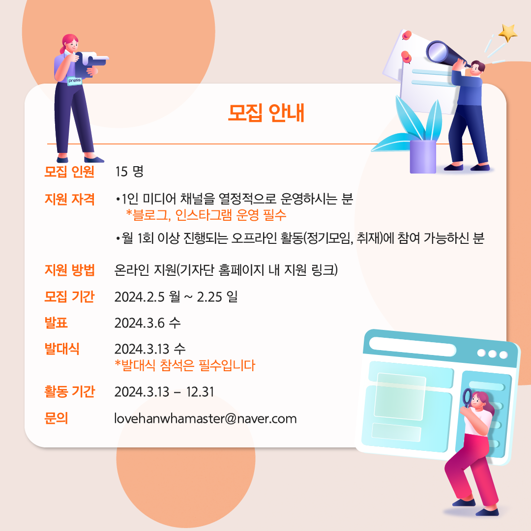 2024년 한화 1인 미디어 기자단의 주인공이 될 사람은 총 15명으로, 블로그와 인스타그램 운영은 필수이며 월 1회 이상 진행되는 오프라인 취재 활동이나 정기모임에 참여가 가능해야 한다. 모집 기간은 2024년 2월 5일부터 2월 25일까지로 지원방법은 온라인 지원이다. 발표는 2024년 3월 6일로, 2024년 3월 13일 발대식 참석은 필수다.