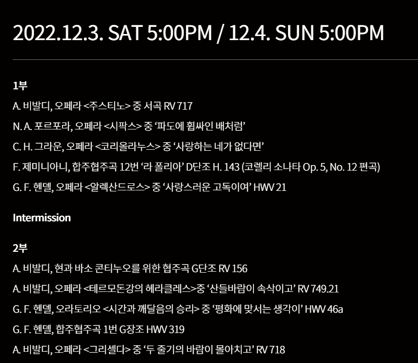 이번 프로그램의 특징은 바로크 대표작들로 구성되어 있다는 것을 알 수 있다. 헨델의 합주협주곡 G 장조 오페라 <알렉산드로스> 중 '사랑스러운 고독이여', 그라운의 오페라 <코리올라누스> 중 '사랑하는 네가 없다면', 비발디 오페라 <테르모돈강의 헤라클레스> 중 '산들바람이 속삭이고' , 제미니아니 합주협주곡 12번 '라 폴리아' 등 베니스 바로크 오케스트라의 연주와 소프라노 율리아 레즈네바가 표현할 작품들이 너무나도 기대가 된다.