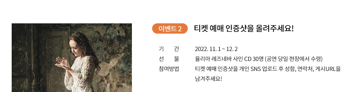 두번째 이벤트는 티켓 예매 인증샷을 올리면 율리아 레즈네바 사인 CD를 30명에게 증정하는 이벤트다. 공연 당일 현장에서 수령가능한 이벤트로 티켓을 예매했다면 두번째 이벤트 참여는 필수일 것이다! 사인 CD의 행운을 받을 30명이 너무나도 궁금해진다. 이벤트 참여 등 자세한 것은 하단의 한화클래식 2022 홈페이지를 참고하면 되겠다.